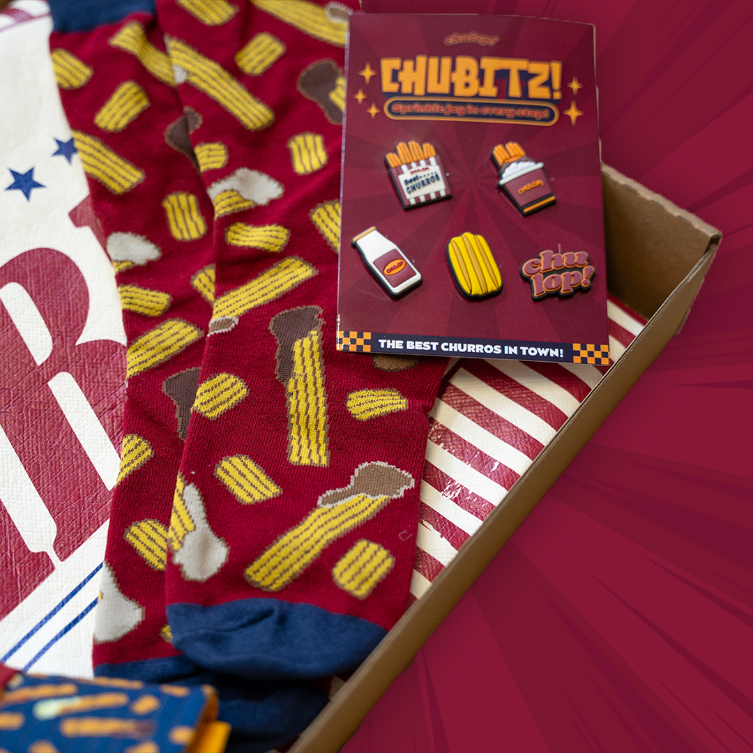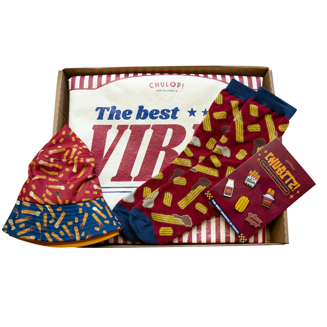 This limited-edition set includes all four signature pieces: the vibrant DuPont tote bag, the playful churro-print bucket hat, the adorable Chubitz charms,